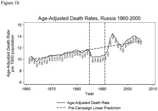 Graph 7: J. Bhattacharya et al. The Gorbachev Anti-Alcohol Campaign and Russia’s Mortality Crisis. American Economic Journal: Applied Economics 5(2) 2013: https://pmc.ncbi.nlm.nih.gov/articles/PMC3818525/