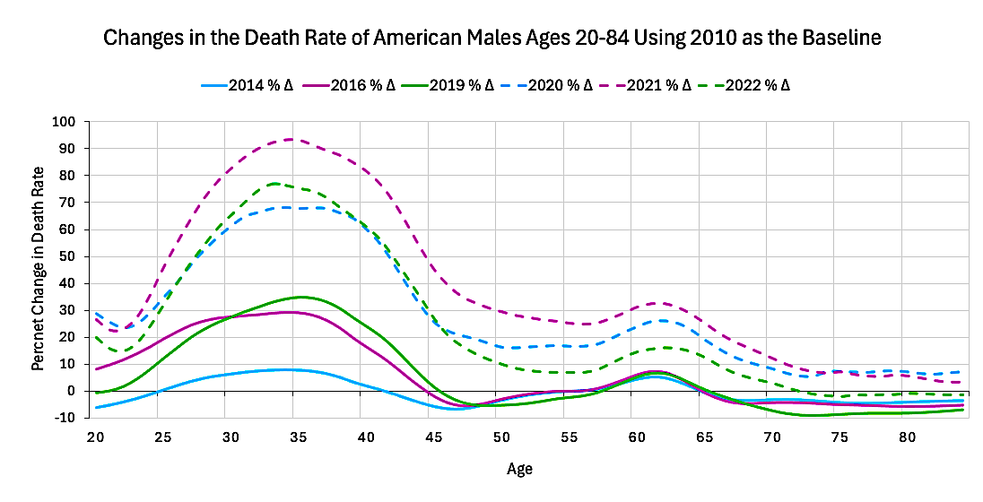 In addition, death rates in these age groups had already been trending upwards by 2014 (Graph 2), but the largest increase occurred after the pandemic had been declared (dotted lines in Graphs 3 and 4).