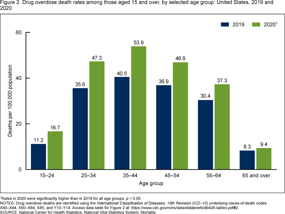 Unsurprisingly, data from the CDC indicates that these age groups were disproportionately affected by drug overdoses in 2019 and 2020 (Graph 5).