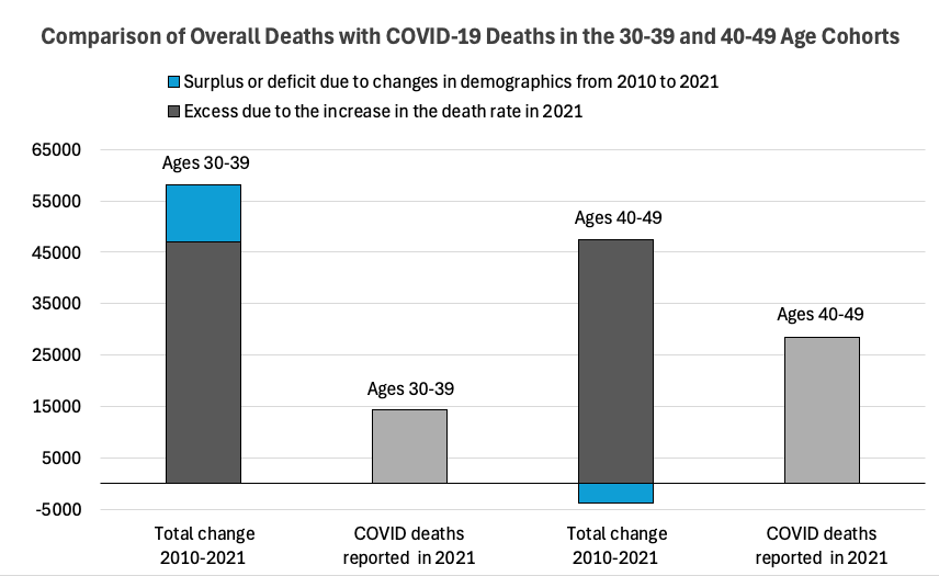 Millennials and Gen Xers died at alarmingly high rates during the deadliest year of the pandemic countermeasures, but for ages 30-39 less than a third of these excess deaths are attributed to COVID-19 (Graph 1).